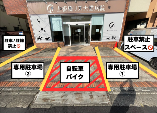 自転車/バイクでご来院の方はスロープ前の赤斜線の場所に停めていただくようお願いいたします。両端の駐車禁止スペースはビル上階の方のスペースですので、絶対に駐車・駐輪しないようにお願いいたします。